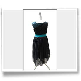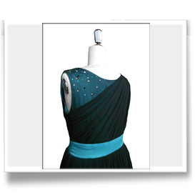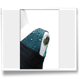 Abito in rasatello di cotone e tulle, decorato sulla spallacon borchie e swarovski. Clicca sulle foto qui sotto per ingrandirle