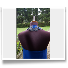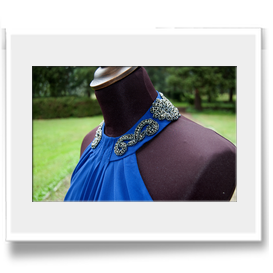 Abito lungo in chiffon di seta azzurro con pannello anterioree collo impreziosito da dettagli in perline e strass. Clicca sulle foto qui sotto per ingrandirle