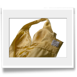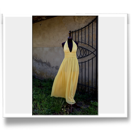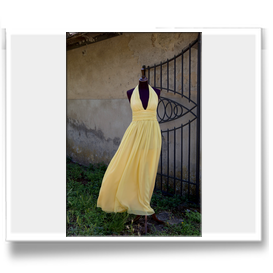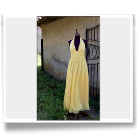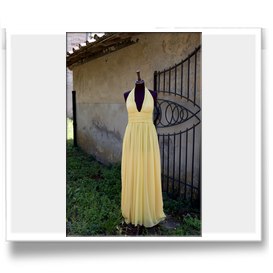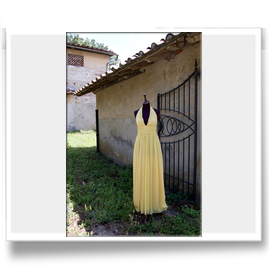 Abito in chiffon di seta giallo con drappeggisu tutta la parte superiore dell'abito. Clicca sulle foto qui sotto per ingrandirle