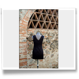 Tubino in rasatello di cotone con scollo a V nella parte posterioredecorato con catene dorate. Clicca sulle foto qui sotto per ingrandirle
