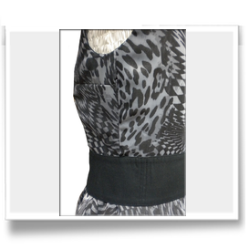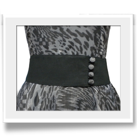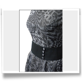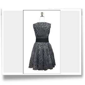 Abito dalla linea anni '50 in organza stampata con cintura in cotone nero. Clicca sulle foto qui sotto per ingrandirle