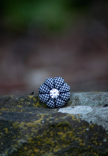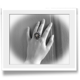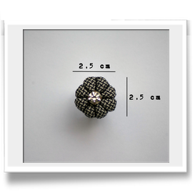 Anello in tessuto fantasia bianco e nero con bottone strass che valorizzerà il vostro look con un tocco originale. Adatto a qualsiasi occasione e perfetto per un tocco stravagante al vostro outfit.