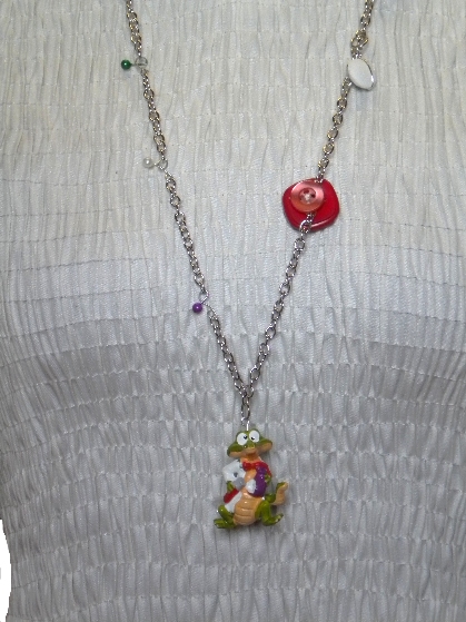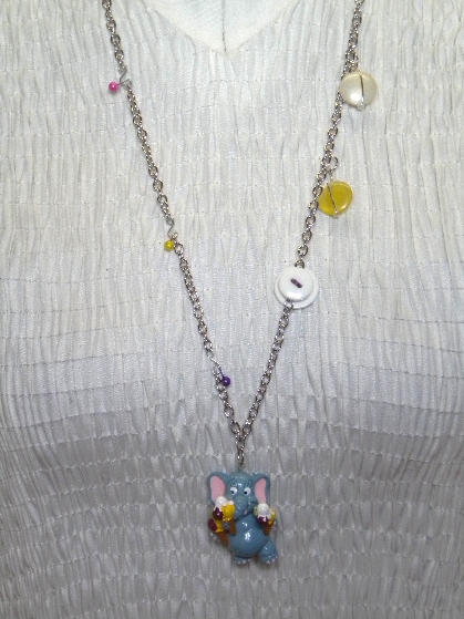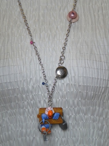 Per il ciondolo "principale" ho riciclato la vecchie sorprese da collezione di Kinder sorpresa, mentre per le altre decorazione ho utilizzato bottoni vintage e spilli con capocchia colorata.