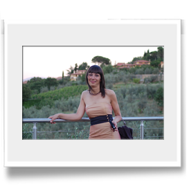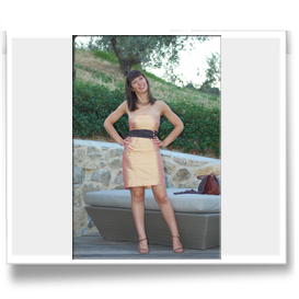 Abitino aderente in shantung di seta color salmone con cintura della stessa stoffa ma di colore marrone, con bottoni ricoperti dello stesso tessuto dell'abito.