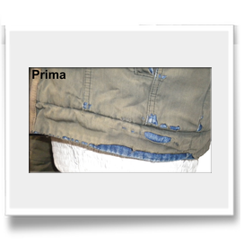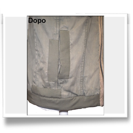 L'ho aggiustata creando delle toppe in cotone verde militare applicate a mano su tutta la superfice danneggiata.
