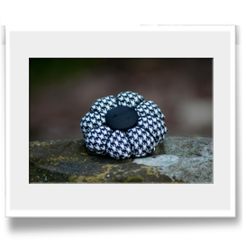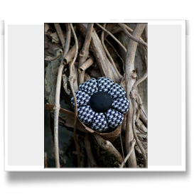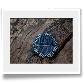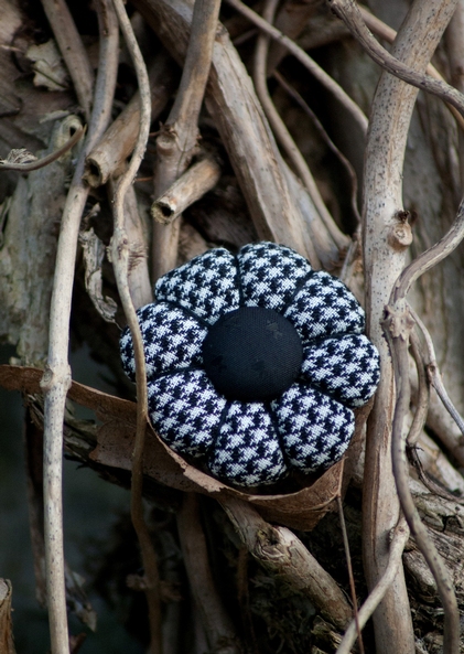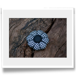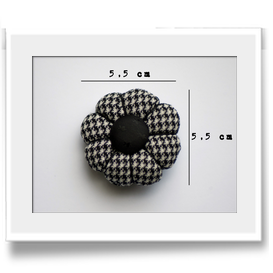 Spilla in tessuto fantasia bianco e nero con bottone nero che valorizzerà il vostro look con un tocco originale. Adatto a qualsiasi occasione e perfetto per un tocco stravagante al vostro outfit.