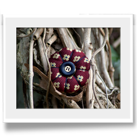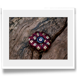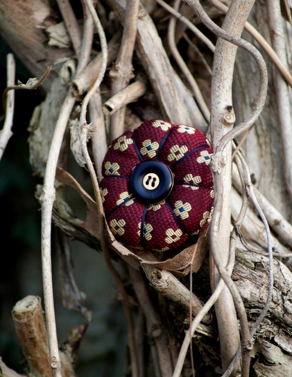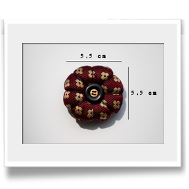 Spilla in tessuto fantasia con bottone vintage che valorizzerà il vostro look con un tocco originale. Adatto a qualsiasi occasione e perfetto per un tocco stravagante al vostro outfit.